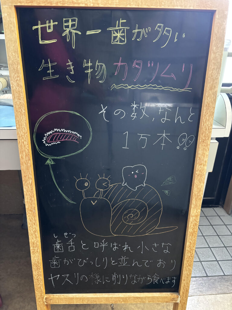 2025.11.27 ブログ ブラックボード更新 動物シリーズ!第二弾!!! なんとびっくり、世界一歯が多い生き物はかたつむりなのです 世界一の歯の本数(1万~2万本!) 歯はとても小さくて肉眼では見えないほど カタツムリの種類や食べるものによって歯の数や形が違う 歯舌は使うたびにすり減るけど、奥から新しい歯がどんどん生えてくる かたつむりすごい! ページ送り 一覧へ