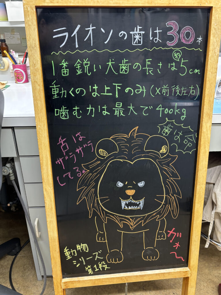 2025.09.30 ブログ ブラックボード更新 ブラックボード更新しました 動物シリーズを今回から初めてみることにしました 第一回目はライオンです野生のライオンは歯がなくなると死んでしまうそうです 生きる=食べる! 歯は本当に大事ですね ページ送り 一覧へ