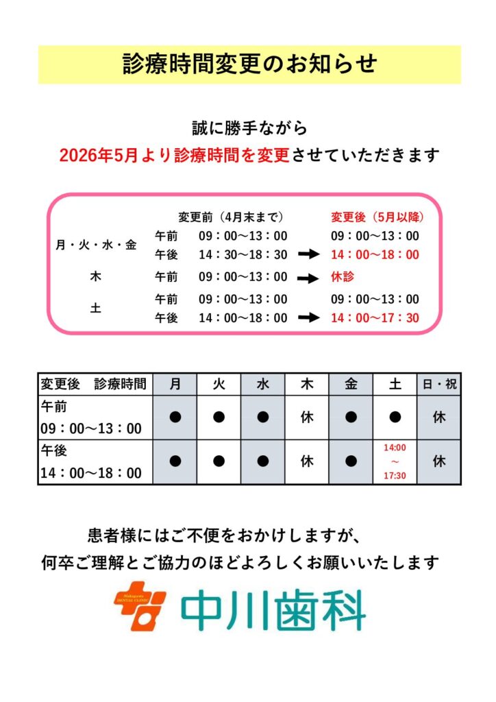 2026.04.28 重要なお知らせ 5月の診療案内・診療時間変更のお知らせ 5月1日より上記へと診療時間が変更となります木曜日も完全休診となります また、5月23日土曜日は院長が午前中不在のため午前中のみ休診となります午後は通常診療いたします よろしくお願いいたします ページ送り 一覧へ